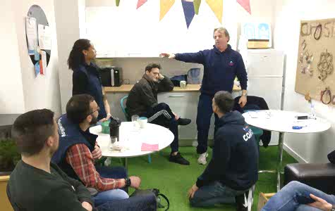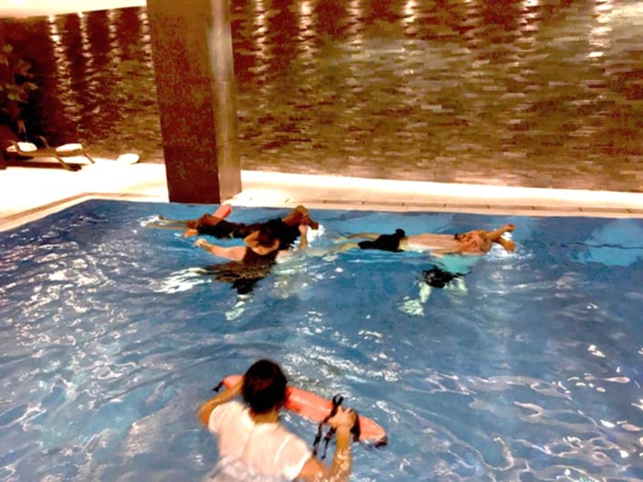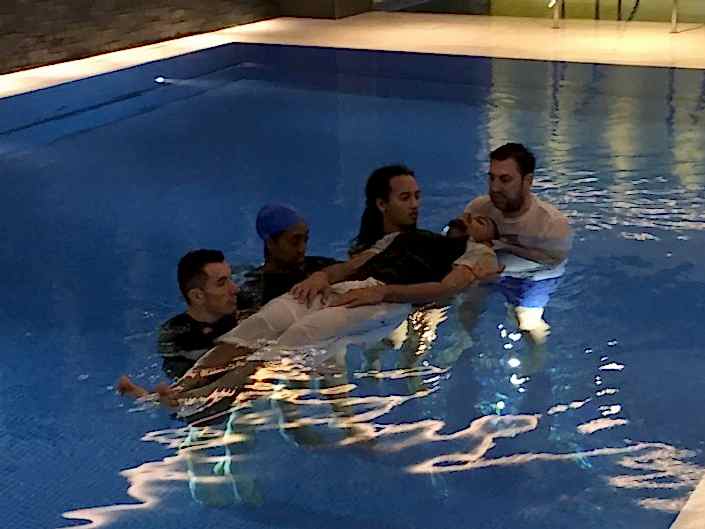 Total Fit staff attempting the 2 person spinal injury management technique with the aid of a torpedo buoy