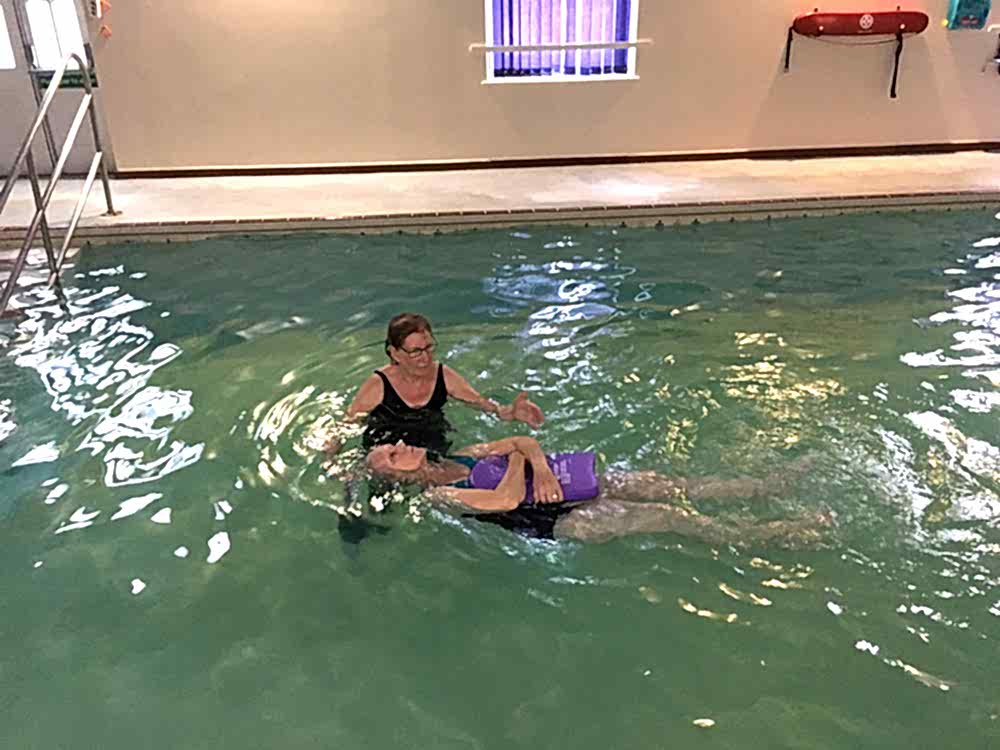 Frances, 82 years, performing back crawl leg kick and a back star float – previously Frances was a non-swimmer, very nervous and scared of the water